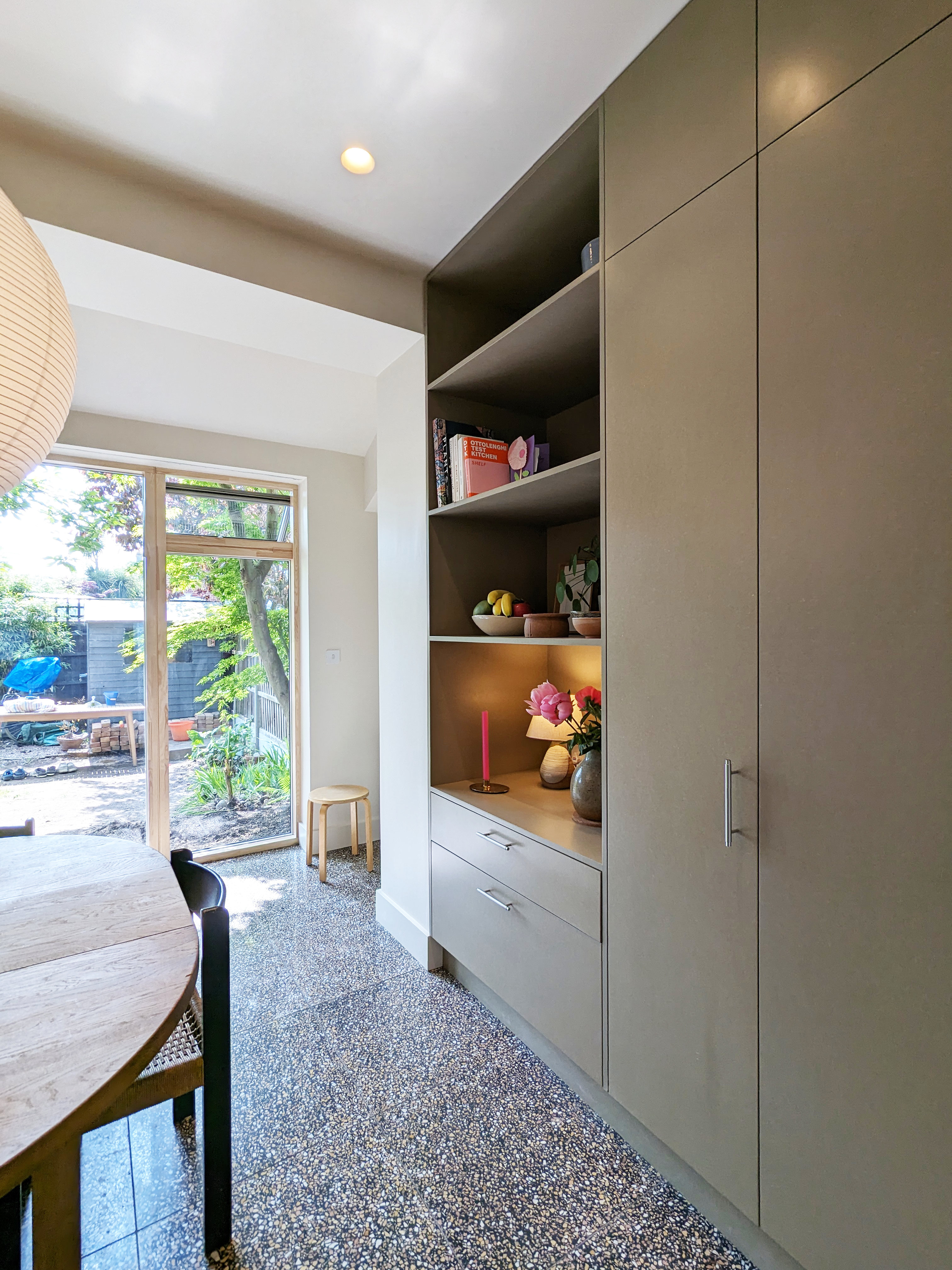 The interior material palette is calm, grounded and natural. The dark stone terrazzo floor gives a solid base to the kitchen, with variations in speckled colours picking up on interior finishes throughout the space, with a reflectant quality to gently bounce light deep into the room. The joinery backdrop comprises deep shelves, larder and laundry, using soft grey-green Valchromat. The kitchen is light and neutral, with a thin stainless steel worktop, mosaic splashback, built in cooker hood and simple timber shelf with wall lights over.