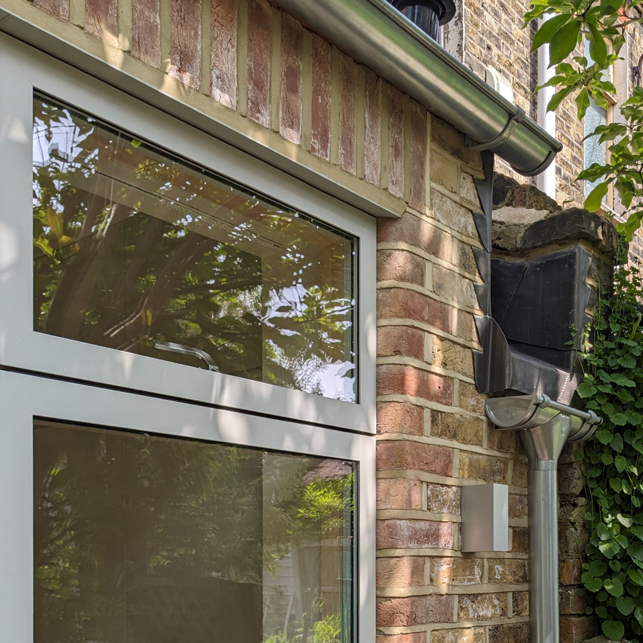 The exterior palette features red brick header bricks and curved red bricks to the reveals, bringing a softness and openness to the elevation, and drawing on existing red brick detailing in the existing building. Yellow London stock bricks are toothed in from the former outbuildings. Deep lead-lined gulleys allow the extension roof to rise higher that the original boundary walls, with raw aluminium rainwater goods.Light grey aluminium window framing and external lights bring contemporary touches to this calmly composed and elegant facade.