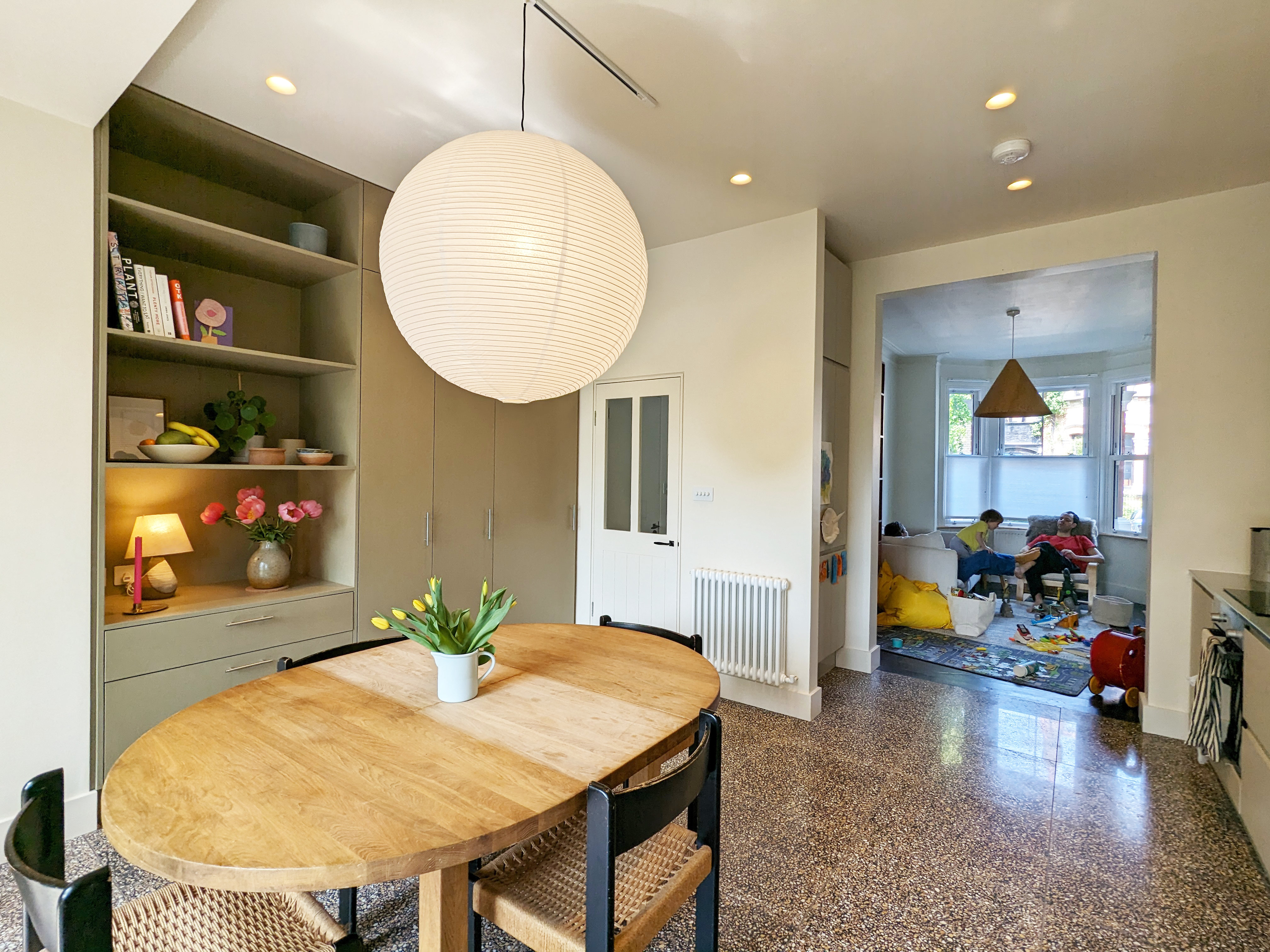 The space is orientated around a large family dining table, with kitchen counter on one side and joinery storage wall on the other.