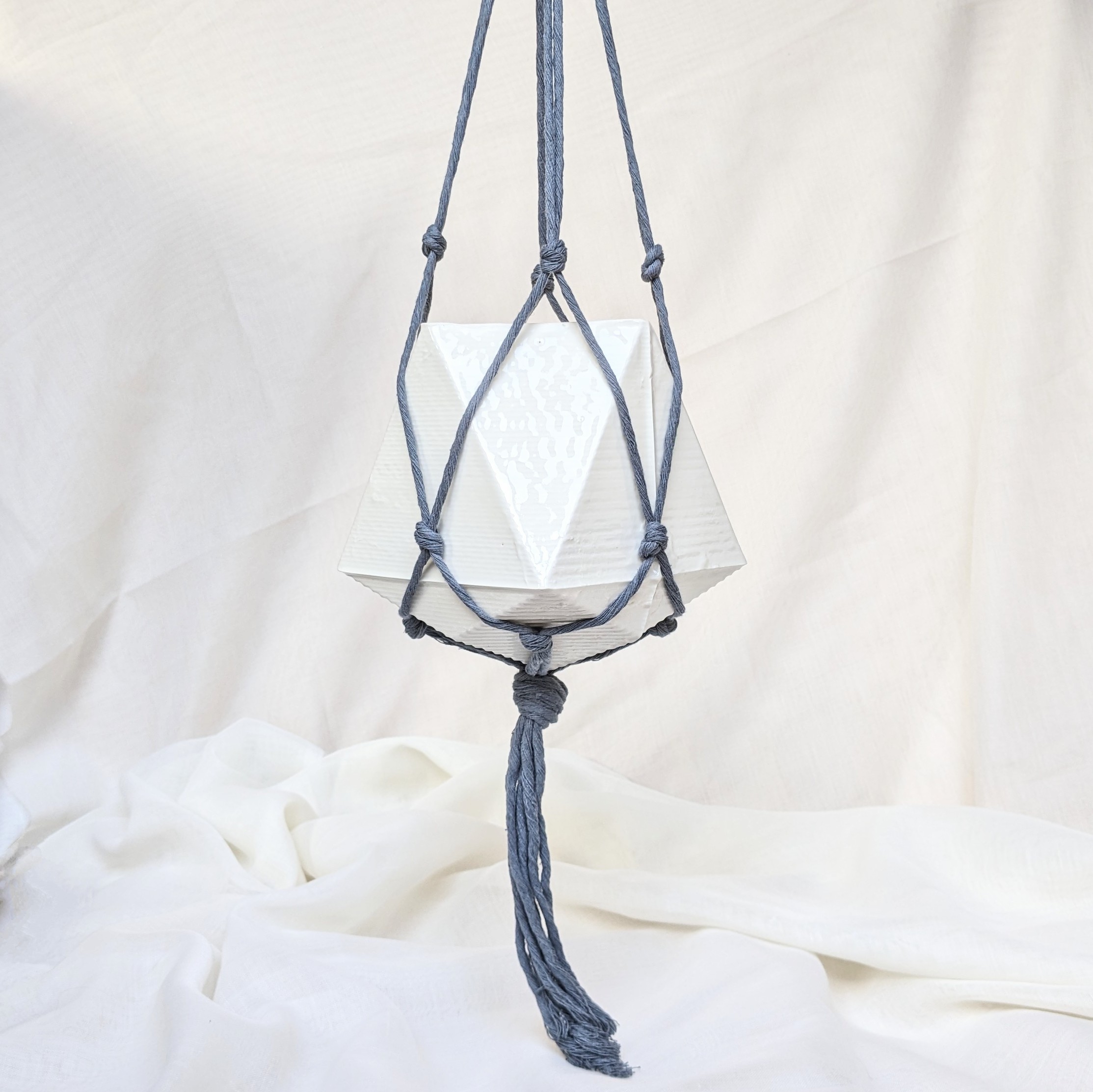 Handmade by Lydia from Macrame cotton cord with simple knots to align with the Iso Planter pots. Lengths vary between approximately 60 and 80cm, in three colours.